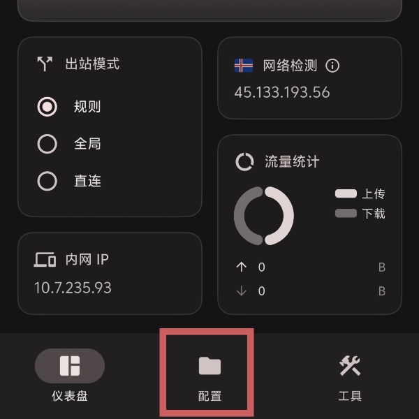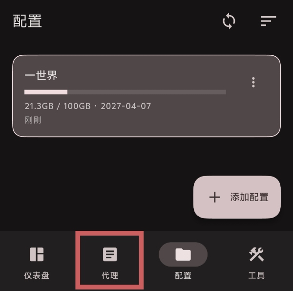 提交后将返回配置页面,出现新配置时代表配置已经成功导入,此时点击屏幕下方的代理按钮