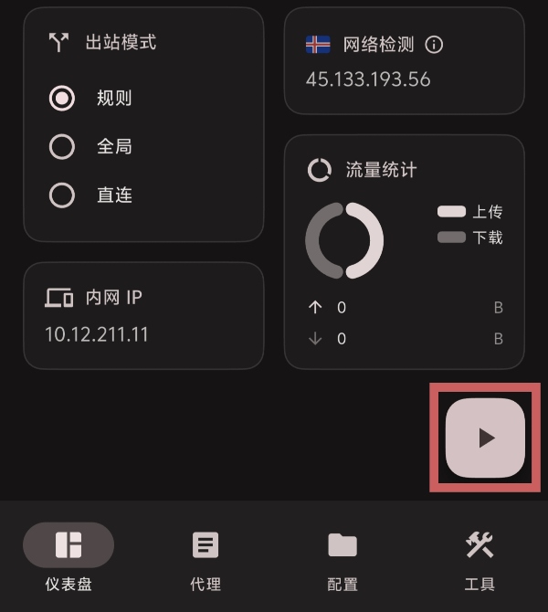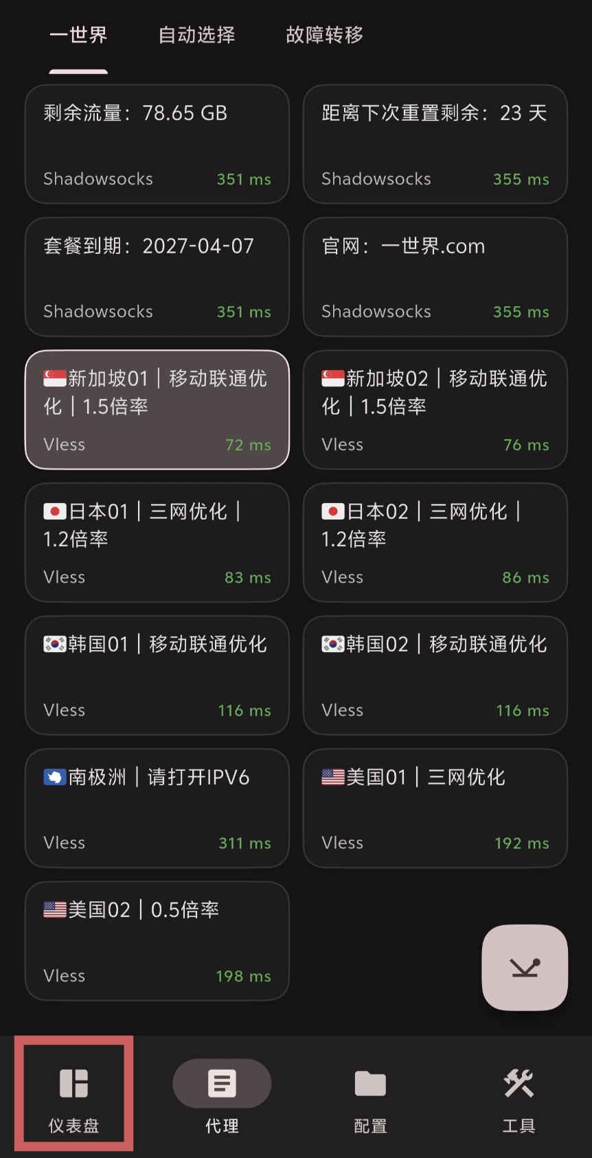 在代理页面中选择需要使用的节点,选中后点击屏幕下方的仪表盘按钮
